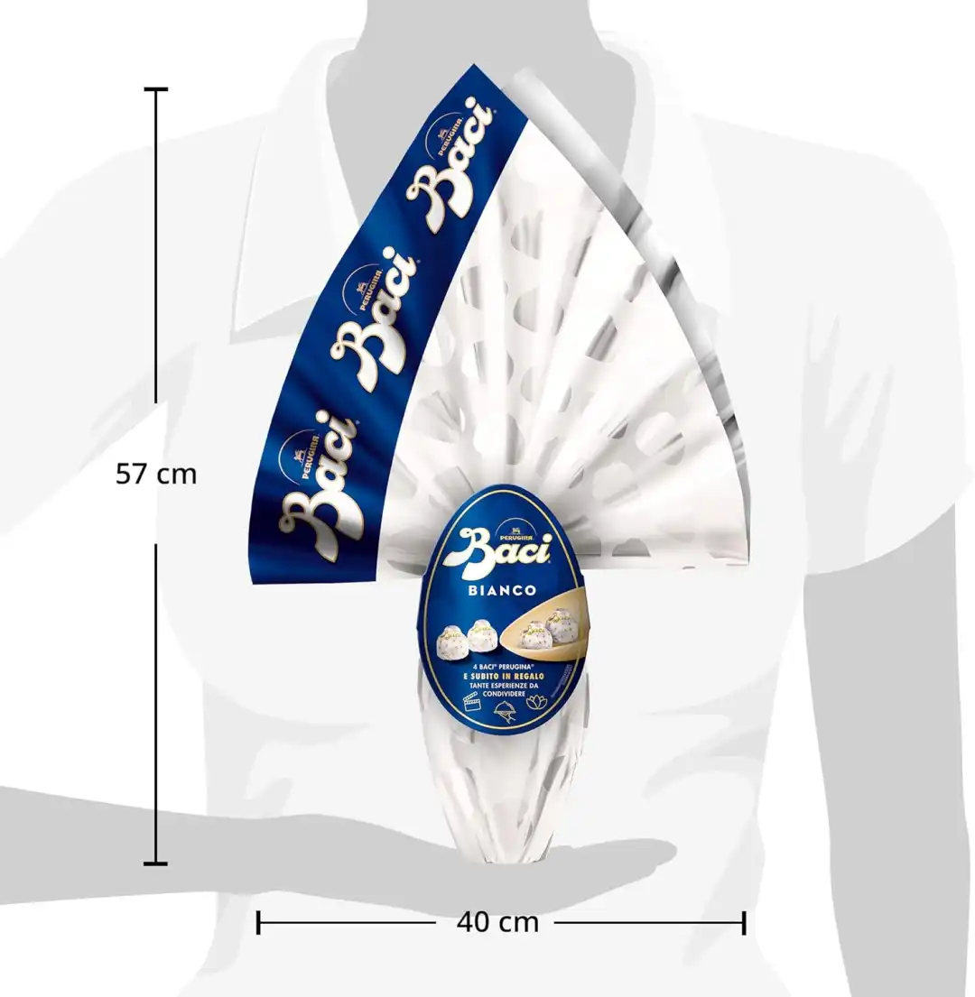 Inoltre, l'uovo è accompagnato da 4 cioccolatini Baci Perugina, con il loro inconfondibile ripieno di nocciola e cioccolato fondente, che arricchiscono ulteriormente questa prelibatezza.