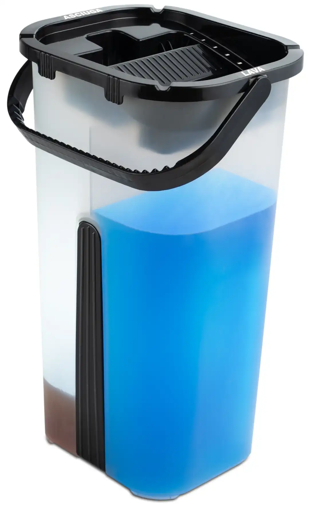 Il secchio compatto è dotato di sistema integrato che permette di lavare e strizzare il panno facilmente, mantenendo l’acqua sporca separata e facilitando il controllo dell’acqua.