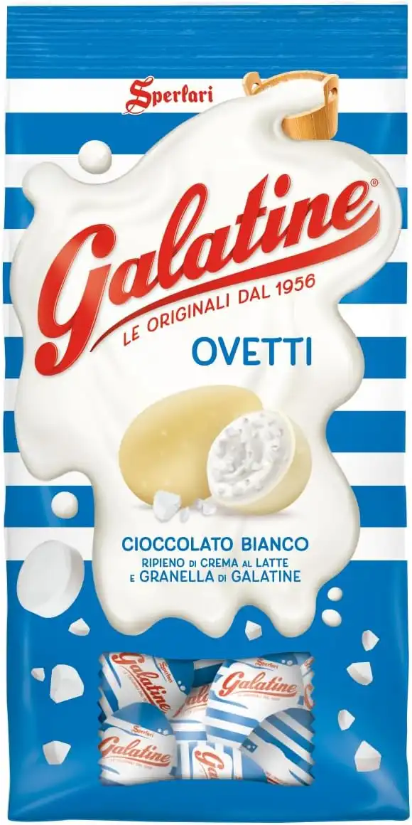 Galatine Ovetti al Cioccolato Bianco da 150 g sono una deliziosa specialità che unisce la dolcezza del cioccolato bianco alla croccantezza inconfondibile delle scaglie di Galatine, per un’esperienza di gusto unica e irresistibile.