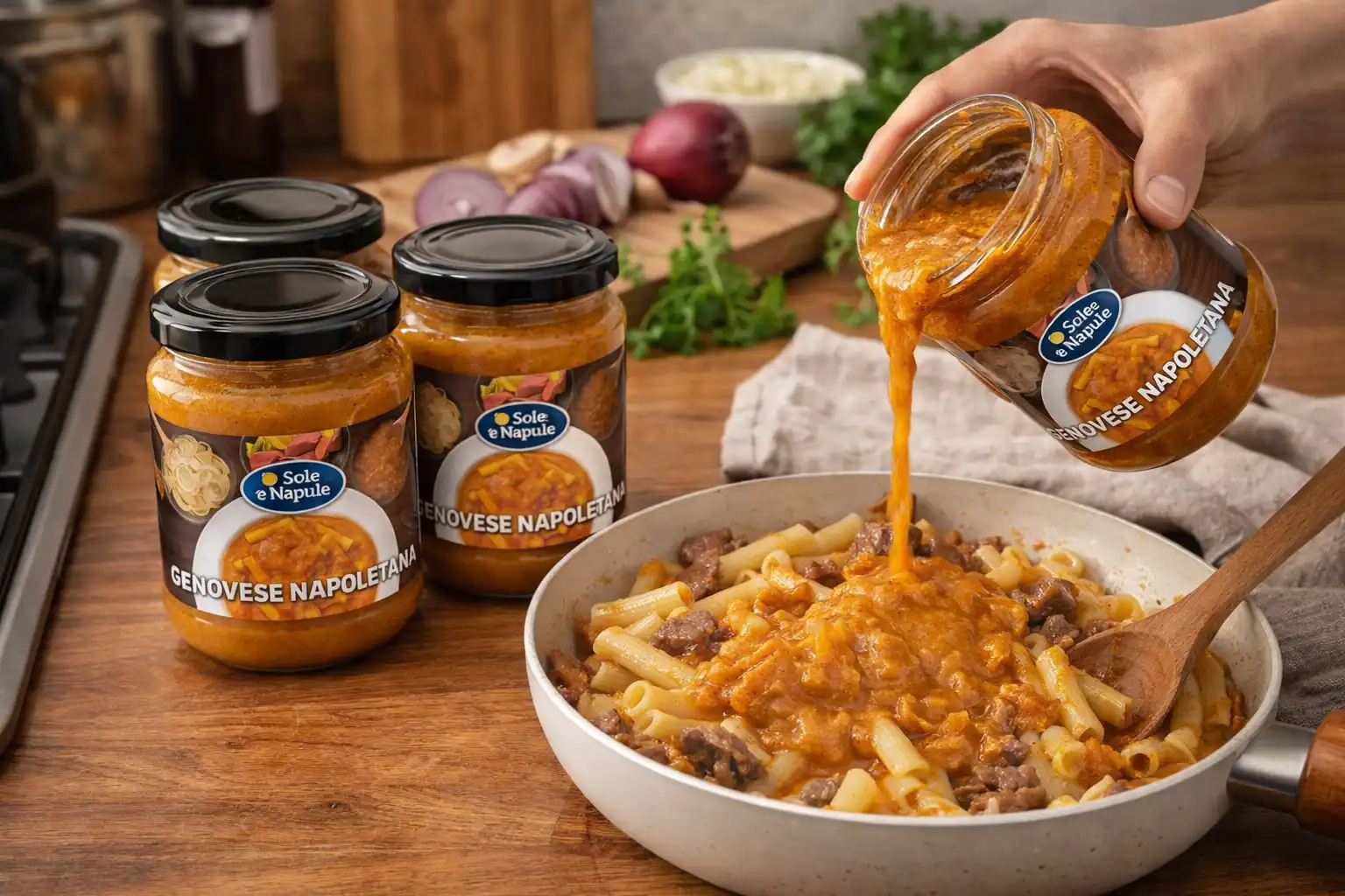 Il sugo alla Genovese è preparato con cipolle lentamente stufate e ingredienti selezionati, per ottenere una consistenza cremosa e un gusto intenso ma equilibrato, ideale per esaltare primi piatti di pasta lunga o corta.